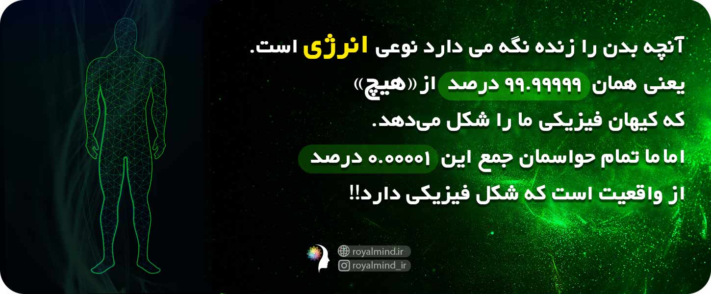 آنچه بدن را زنده نگه میدارد نوعی انرژی است یعنی همان 99.99999 درصد از «هیچ» که کیهان فیزیکی ما را شکل میدهد. خندهدار نیست که ما تمام حواسمان جمع این 0.00001 درصد از واقعیت است که شکل فیزیکی دارد؟