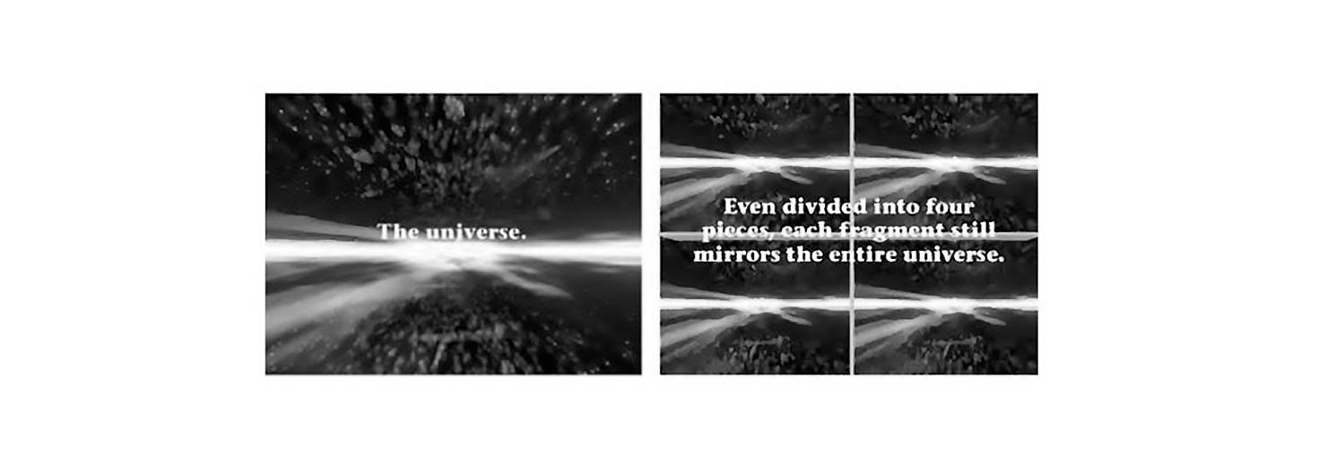 اگر چیزی هولوگرافیک باشد و آن را به قطعات کوچکتری تقسیم کنیم، آنگاه آن چیز به طور کامل در همهی قطعههای خودش وجود دارد. این تصویر به خوبی نشان میدهد که هر قدر هم جهان را تقسیم کنیم، هر بخش از آن همچنان انعکاس کل جهان خواهد بود، فقط در مقیاسی کوچکتر!»