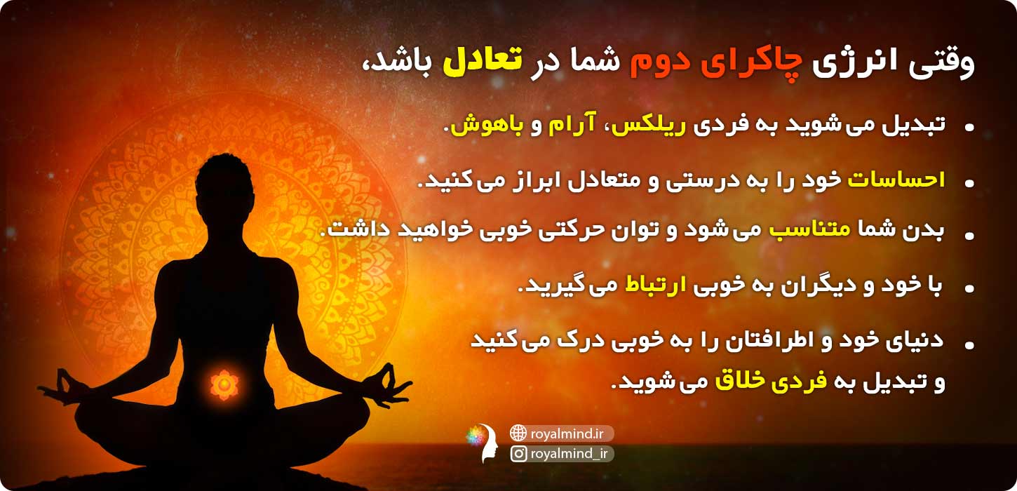 تعادل در چاکرای دوم: تبدیل میشوید به فردی ریلکس، آرام و باهوش. احساست خود را به درستی و متعادل ابراز میکنید. با خود و دیگران ارتباط خوبی دارید و دنیا خود اطرافتان را به خوبی درک میکنید و تبدیل به فردی خلاق میشوید.