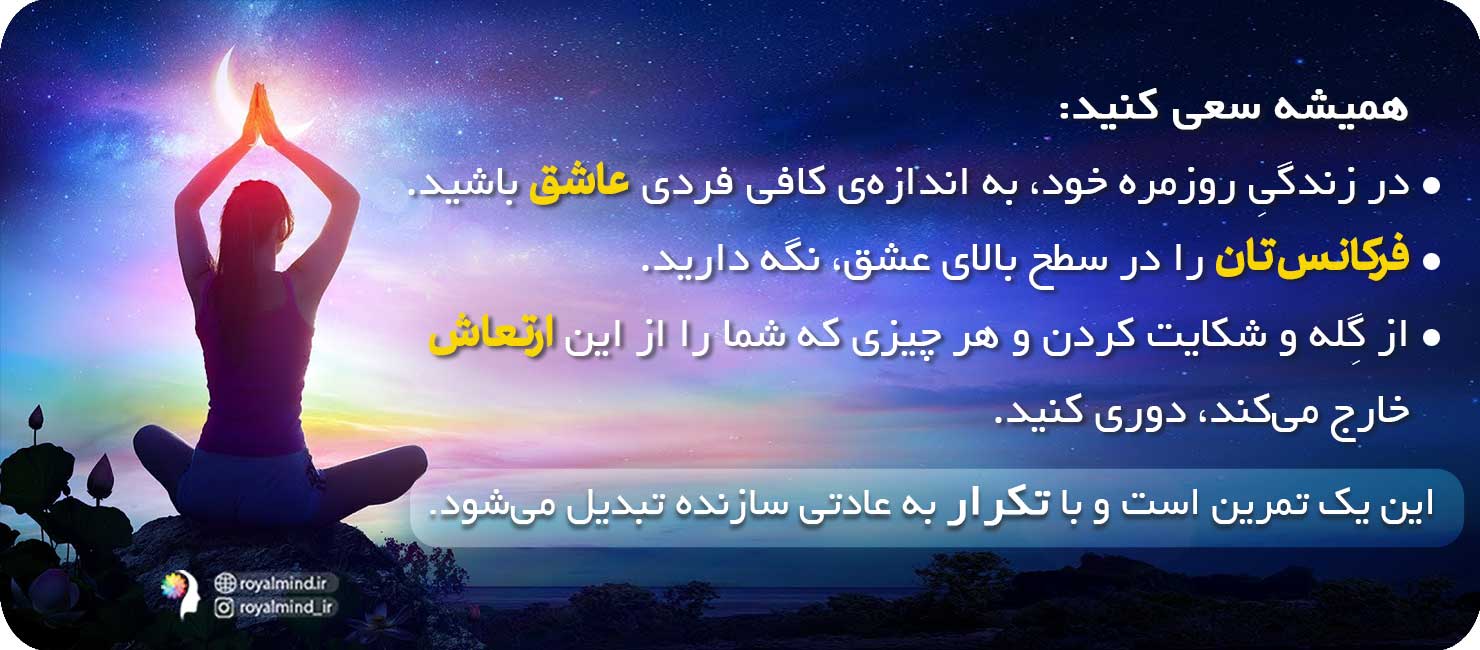 پیشنهاد میشود، فرکانس عشقتان را افزایش دهید. تصمیم بگیرید و این کار را انجام دهید. همه چیز به انتخاب و تصمیمتان بستگی دارد. آن را انتخاب کنید، به دستش آورید و از مواهب و مزایای آن بهره گیرید. به خاطر داشته باشید، تلاش کنید تا به اندازه کافی در زندگی روزمره فردی عاشق باشید و ارتعاشتان را در سطح بالای عشق نگه دارید. ممکن است قرار گرفتن در سطح ارتعاشی بالا به چالشتان تبدیل شود، به این معنا که باید در طول روز از شکایت کردن، ناله کردن و هر چیزی که باعث شود، حس کنید از این ارتعاش خارج شدید، اجتناب کنید.