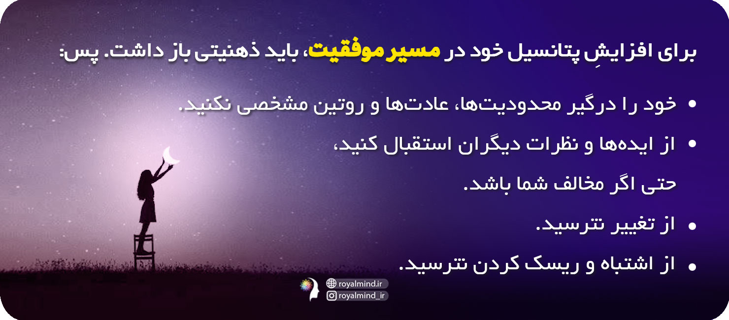 در صورتی که بخواهیم پتانسیلمان را برای موفقیت در زندگی فردی و حرفهای، روابط شخصی و به طور کلی در زندگی به حداکثر برسانیم، لازم است ذهنیتی باز، منعطف و بدون ساختاربندی مشخص داشته باشیم. تعیین محدودیت و چهارچوب، زنگ خطری برای بسته شدن دریچههای ذهن است. اینگونه مطابق عادت، روتین یا روال مشخصی پیش میرویم و میتوان گفت تنها از یک زاویه دید به دنیا نگاه میکنیم. در نظر ما همه چیز یا سیاه است یا سفید، یا ۰ است و یا ۱۰۰ و حد وسطی وجود ندارد. بین سیاه و سفید هزاران رنگ و بین ۰ تا ۱۰۰ هزاران عدد و احتمال وجود دارد. با محدود کردن خود در چهارچوبهای مشخص، خود را از دیدن این همه زیبایی و پتانسیل محروم میکنیم.