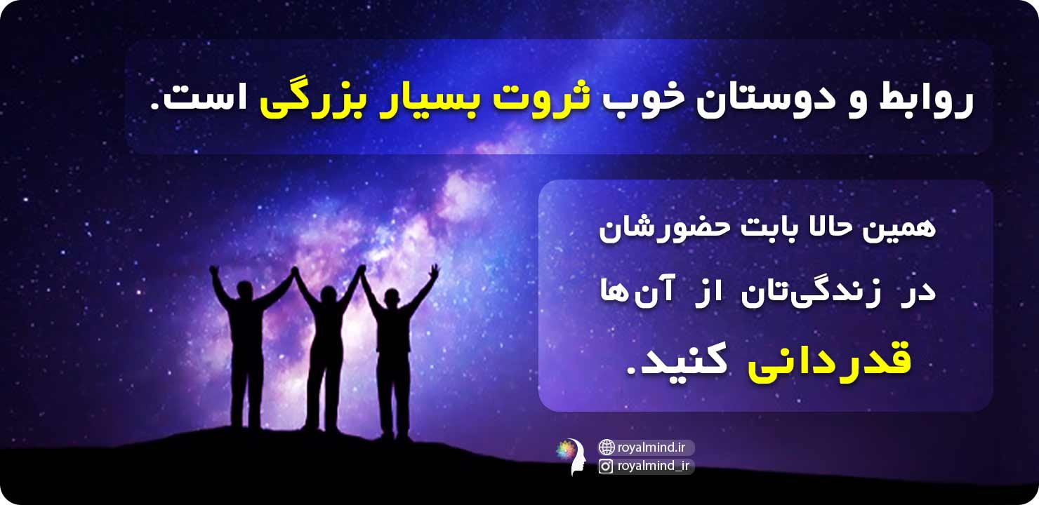 داشتن افراد مناسبتان در زندگی از بزرگترین ثروتهای دنیاست. اگر شما دوستان و روابط خوبی دارید قطعا ثروتمند هستید. دوست خوب ثروت بزرگی است که نه تنها شما را به جلو هل میدهد بلکه آرامش و سلامت روان نیز برای شما به ارمغان میآورد. همچنین اگر روابط کاری خوبی داشته باشید باز هم شما ثروتمندید. داشتن خانواده خوب، دوستان خوب، روابط کاری و عاطفی خوب خود ثروت است. پس اگر حتی یک دوست خوب دارید قدردان او باشید.