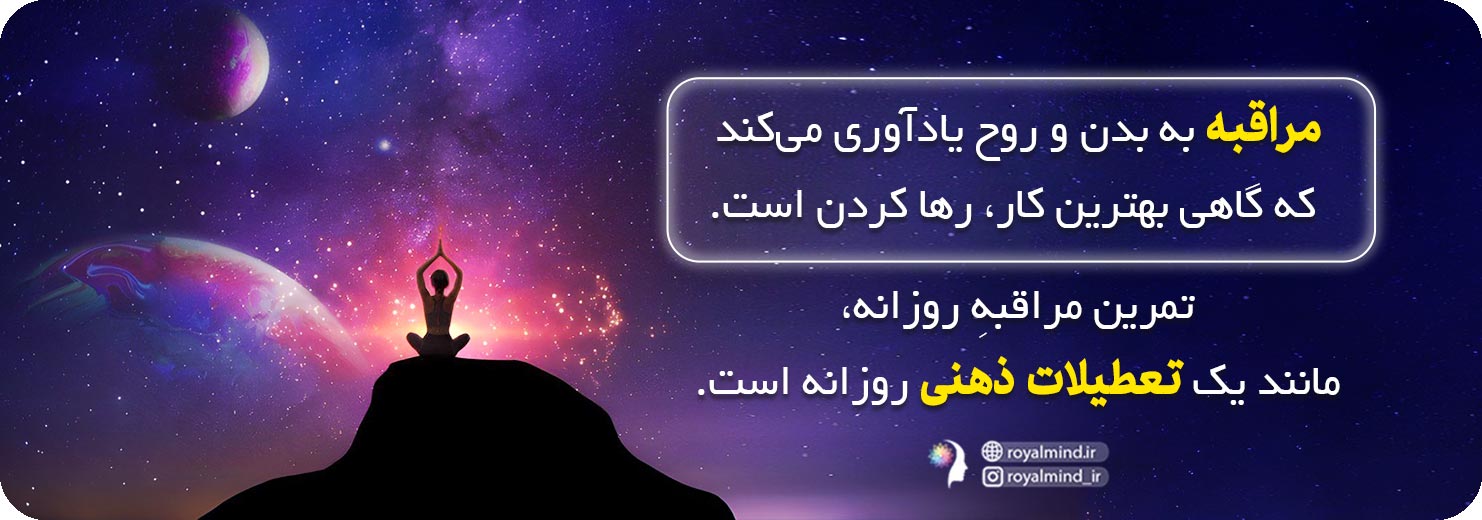 (مراقبه یا مدیتیشن فعالیتی است که در آن از تکنیکهای خاصی مانند ذهنآگاهی برای آموزش و تربیت توجه و هشیاری استفاده میشود و ماحصل آن رسیدن به یک حالت ذهنی و عاطفی آرام و پایدار است. برای شروع میتوانید از دورهی پیشرفتهی "دانداپانی" (کلیک کنید)، که در سایت رویالمایند قرار دارد، استفاده کنید).