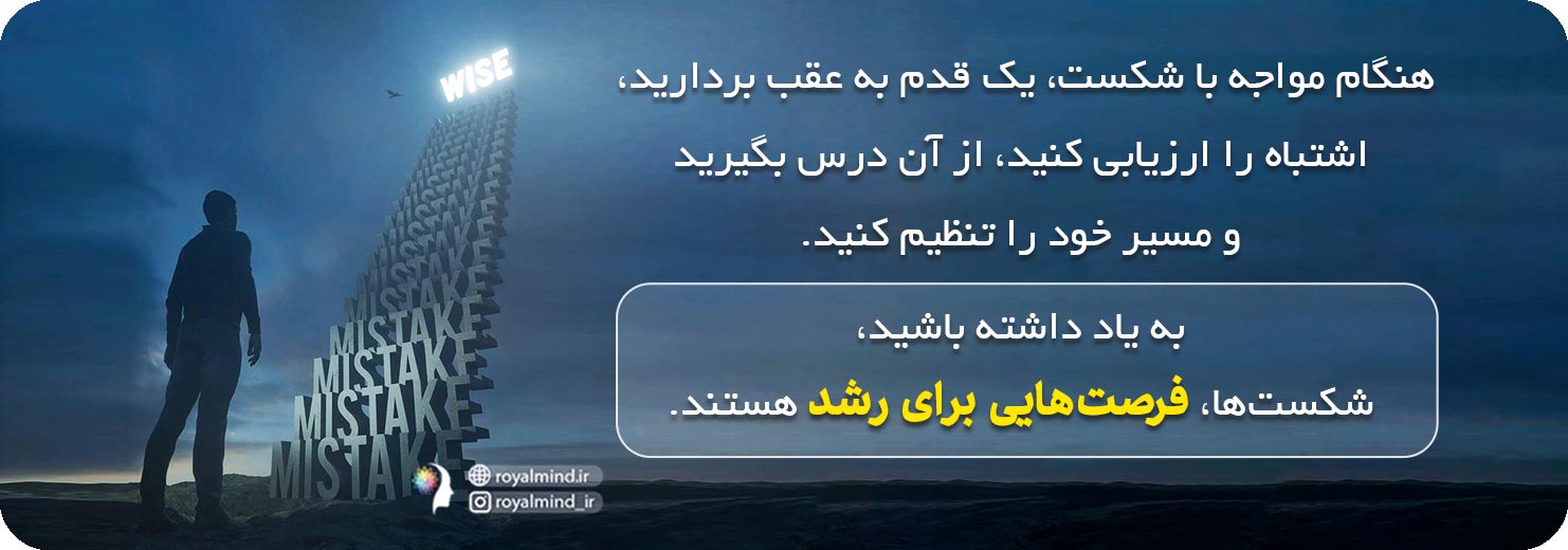 هنگامی که با شکست مواجه میشوید، یک قدم به عقب بردارید، اشتباه را ارزیابی کنید، از آن درس بگیرید و مسیر خود را تنظیم کنید. به یاد داشته باشید، شکستها شکست نیستند. آنها فرصتهایی برای رشد هستند. من توصیفی را که ناپلئون هیلز از شکست در کتاب پرفروش خود «فکر کن و ثروتمند شو» کرده است خیلی دوست دارم. او میگوید: «شکستها موقتی هستند که به ما میگویند برنامههایمان اشتباه است. تنها کاری که باید انجام دهیم این است که برنامههای جدید ایجاد کنیم و تا رسیدن به موفقیت به حرکت ادامه دهیم».