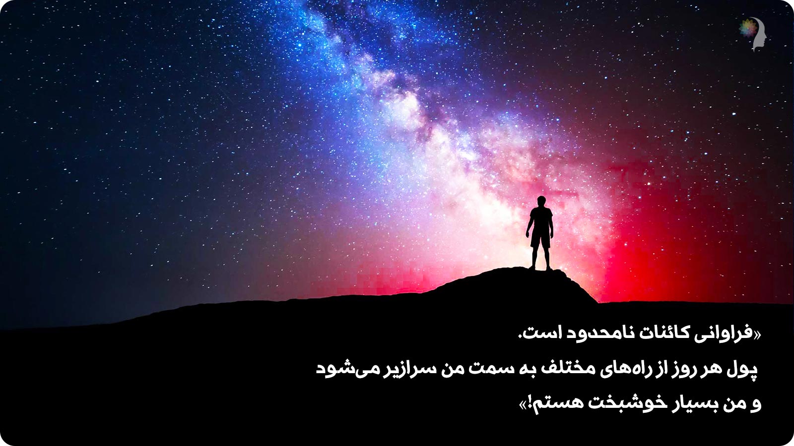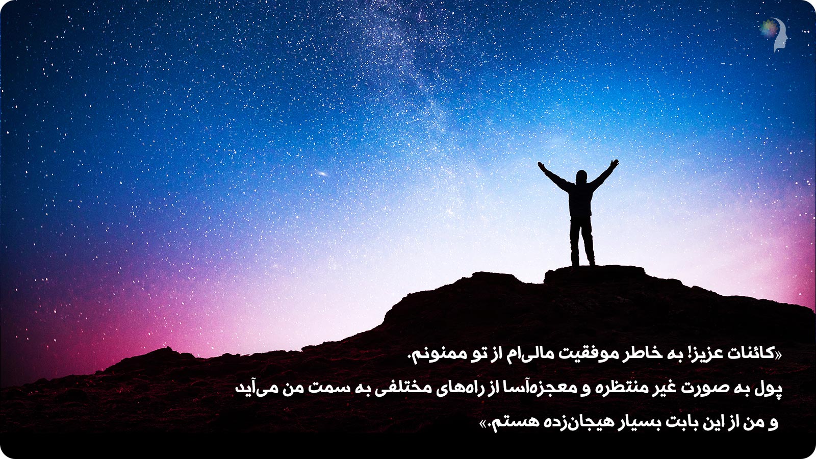 «کائنات عزیز! به خاطر موفقیت مالیام از تو ممنونم. پول به صورت غیر منتظره و معجزهآسا از راههای فراوانی به سمت من میآید و من از این بابت بسیار هیجانزده هستم.»